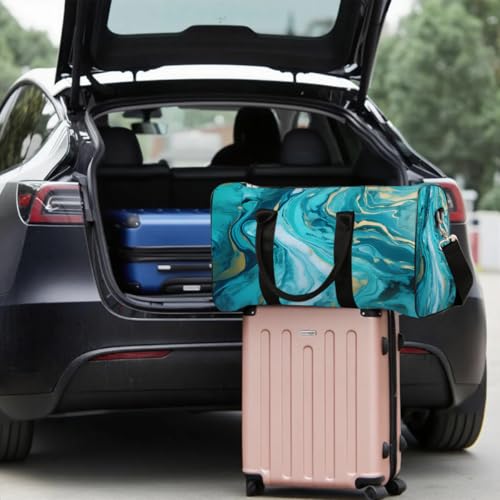 Abstract Teal And Blue Marble Print Travel Duffel Bag Sports Tote Gym Bag Waterproof Tear-Resistant Carry On Overnight Bag Foldable Weekender Bag for Gym Travel Getaway Beach Sports 5