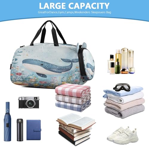 HOT ! Whale Bubble Blue Kids Travel Duffel Bag for Boys Girls Overnight Weekend Tote Bag with Shoes Compartment for Dance Gym Sports