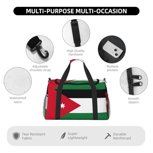 • Pocket Layout: Jordanian flag print Travel Duffle Bag has one main pocket with double-headed zippers for easy access. An internal zip pocket, adjustable strap (70 - 120cm), 65cm handles, side mesh and reinforced webbing with buckle, offering organized storage.