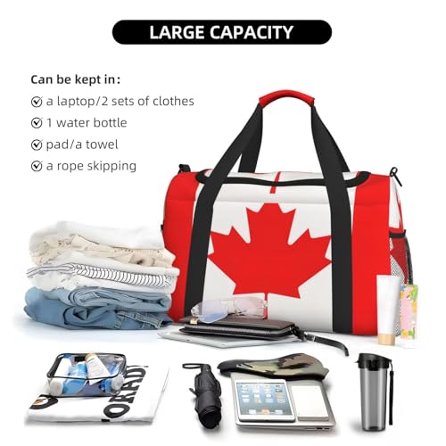 • Pocket Layout: Canadian flag print Travel Duffle Bag has one main pocket with double-headed zippers for easy access. An internal zip pocket, adjustable strap (70 - 120cm), 65cm handles, side mesh and reinforced webbing with buckle, offering organized storage.