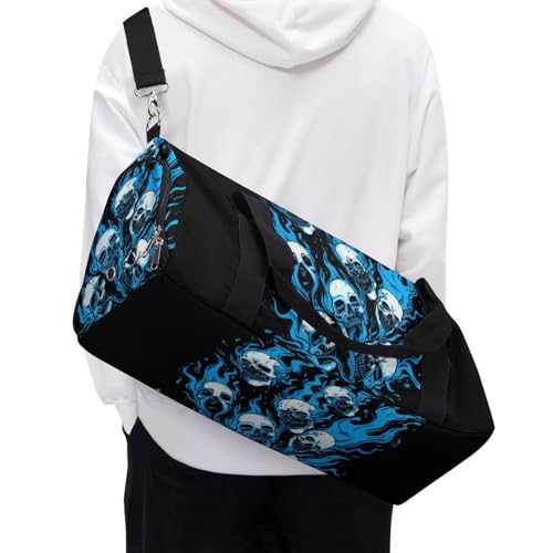 HOT ! Blue Flames Skulls Funny Gym Bag Travel Tote Bag Duffel Bag with Shoe Compartment for Weekender Sports Vacation