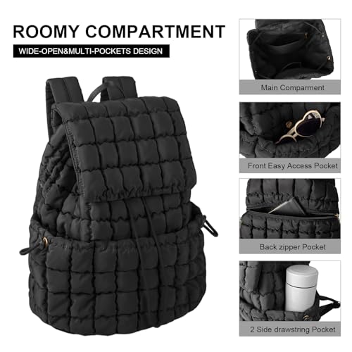 • Large Capacity: Quilted puffer backpack measures 15.2*6.3*11.61 inches and is spacious enough to hold tablets, books, clothes, cosmetics and more in the main compartment, while hidden zippered pockets on the interior and back further help you keep small essentials organized.