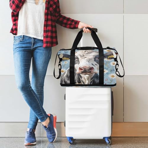 HOT ! Cow and Daisy Flowers Gym Bag for Women Sport Travel Duffel Bag Shoulder Weekender Overnight Bags with Wet Pocket & Shoe Compartment