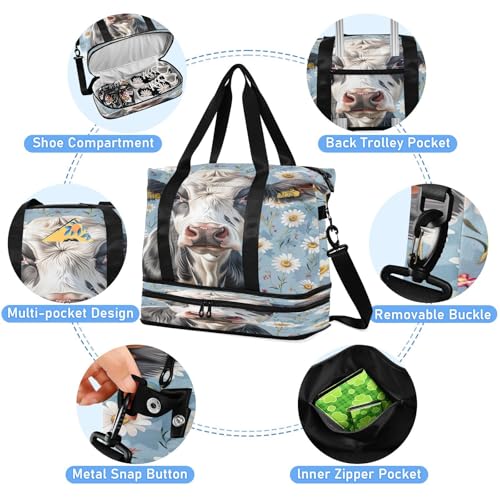 Cow and Daisy Flowers Gym Bag for Women Sport Travel Duffel Bag Shoulder Weekender Overnight Bags with Wet Pocket & Shoe Compartment 5