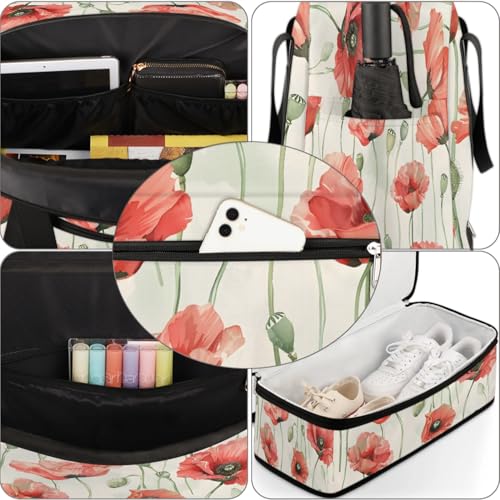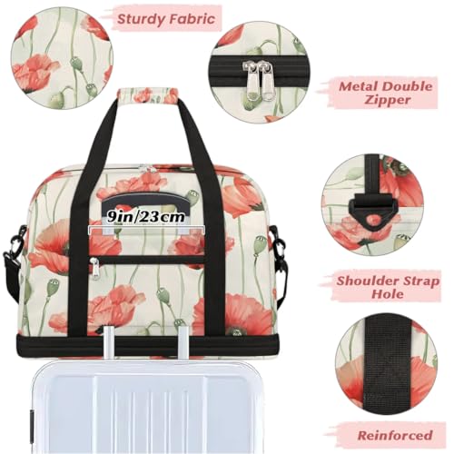 Travel Duffel Bags Watercolor Poppy Foldable Weekender Bags for Women with Shoes Compartment Waterproof & Tear Resistant Carry on Overnight Luggage Duffel Bag Shoulder Sports Tote Bag 5