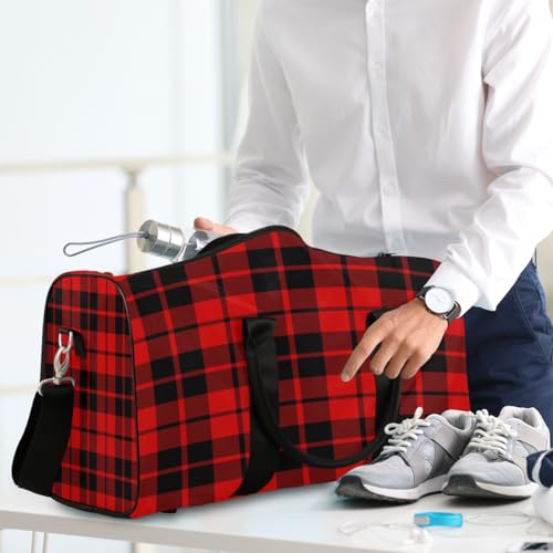 HOT ! Rustic Buffalo Check Plaid Travel Duffel Bag, Black Red Tartan Sports Tote Gym Bag, Foldable Weekender Overnight Bag, Luggage Handle Bag for Women Men