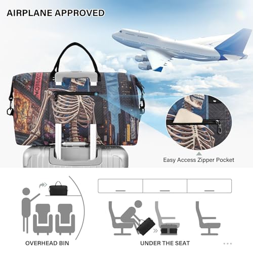 HOT ! Large Travel Duffel Bag, Skeleton in City Sports Tote Gym Bag, Shoulder Weekender Overnight Bag for Women Men, Carry On Luggage with Toiletry Bags