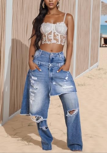 More information about DINGANG Women's Ripped Jeans Baggy Distressed High Waisted Straight Wide Leg Asymmetrical Patchwork Denim Pants