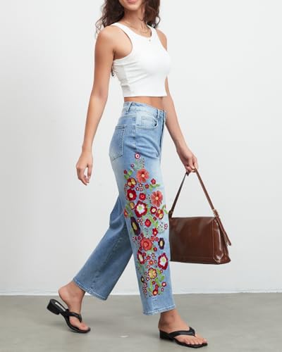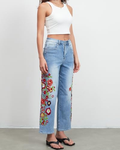 Straight Leg Cropped Jeans for Women Trendy Mid Rise Floral Print Boho Casual Denim Ankle Pants 6