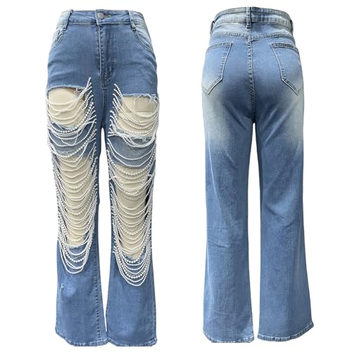 HOT ! NRTHYE Womens High Waist Ripped Jeans Sexy Pearl Chains Rhinestones Straight Leg Stretch Distressed Denim Pants