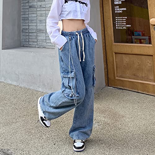 • Feature: Baggy streetwear cargo jeans,High rise straight leg pants style,Unique waist drawstring design,Two side flap pockets and classic functional three pockets,Fashionable and cool chains.