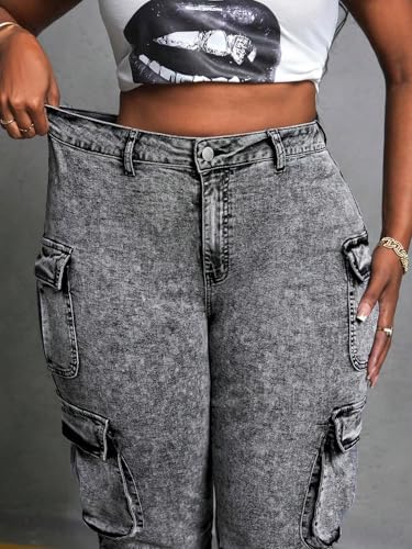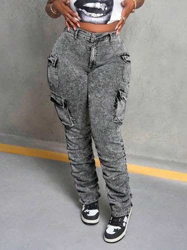 More information about Women's High Waist Cargo Jeans, Acid Wash Ruched Stacked Design, Multi-Pocket