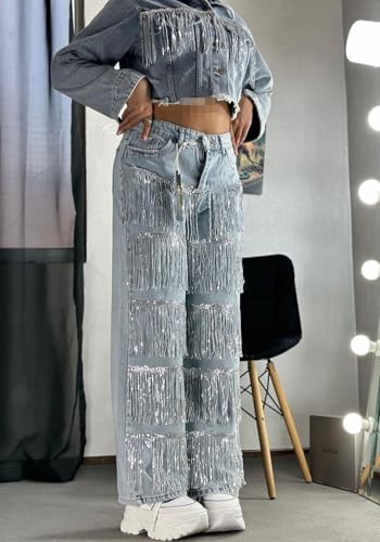 More information about LETSVDO Women's High Waisted Sequin Fringe Jeans Baggy Wide Leg Glitter Sparkly Tassels Denim Pants Trousers