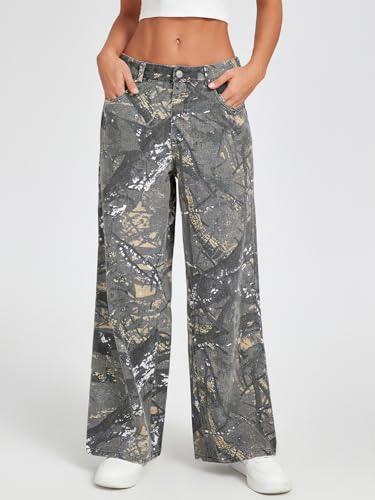 • Features: Faded camo print; Baggy fit; Wide leg; Mid rise; Elastic waist at back; Five pockets; Zip fly and button closure; Full length. Wide leg camo pants for women; Camo sweatpants women; Baggy jeans for woman; Army fatigue pants for women
