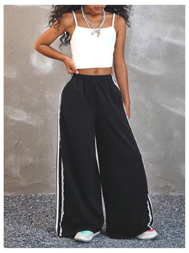 HOT ! MakeMeChic Girl's Lace Striped Wide Leg Sweatpants Elastic Waist Athletic Baggy Pants