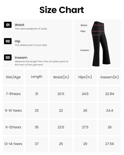 • Comfort & Support: Our girls' activity leggings feature a high-waist design that offers gentle tummy support and a secure, comfortable fit during all day. The higher waist of the flare legging helps create a smooth silhouette and provides freedom of movement. Four sizes of leggings: girls leggings size 7-8, girls leggings size 9-10, girls leggings size 11-12, and girls leggings size 13-14. Designed for comfort and confidence, flared yoga pants move with her from the playground to practice!