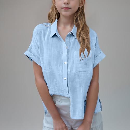 Girls Button Down Cotton Linen Shirts V Neck Roll Up Short Sleeve Blouses Loose Collared Shirt Summer Casual Tops 6