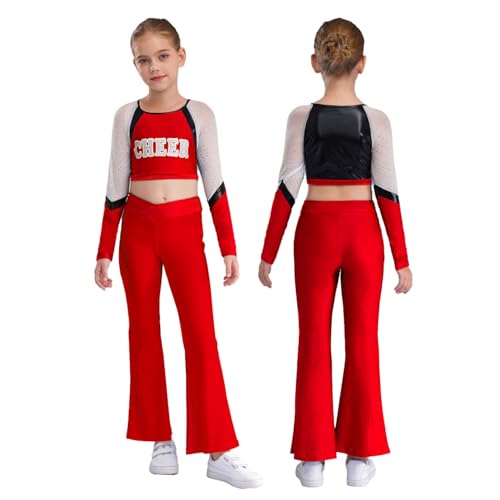 HOT ! Kids Girls 2 Piece Gymnastic Dance Outfits Sparkly Long Sleeve Color Block Cheer Crop Top And Flared Pants Set Red 10 Years