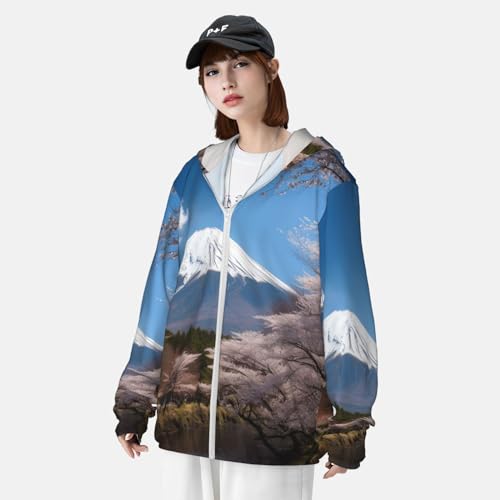 HOT ! Sun Protection Hoodie for Men Women UPF 50+ Long Sleeve Rash Guard Jacket Mt. Fuji in Early Spring Lightweight Sun Shirt