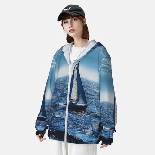 HOT ! Men's UPF 50+ Light Jacket Blue Sea Sailboat Sun Protection Hoodie Long Sleeve Sun Shirts for Women