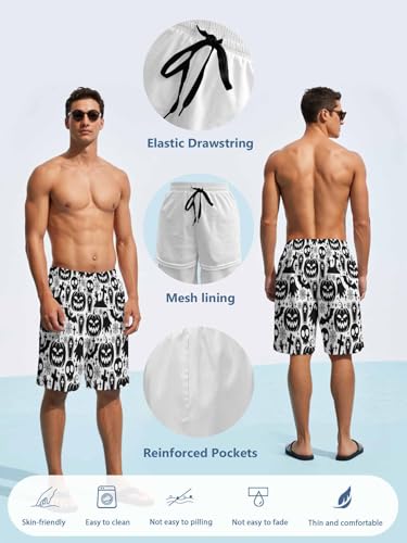 Mens Swim Trunks with Compression Liner,Halloween Skull Ghost Men's Inseam Board Shorts Quick Dry Bathing Suit for Men/Boys 7