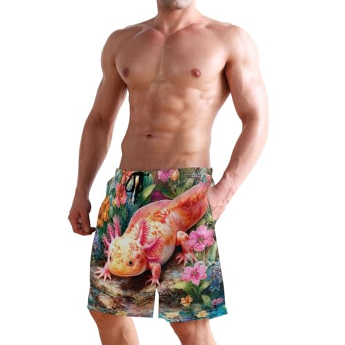 HOT ! Men's Swim Trunks Quick Dry Swimming Shorts with Pocket Colorful Axolotl in Floral Garden Swimsuit Trunks