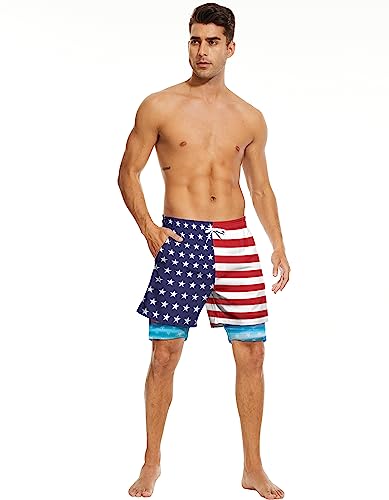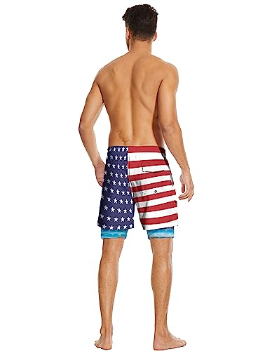 HOT ! American Flag Shorts Men's Swim Trunks with Compression Liner Patriotic Men Swimming Trunks Bathing Suits