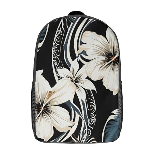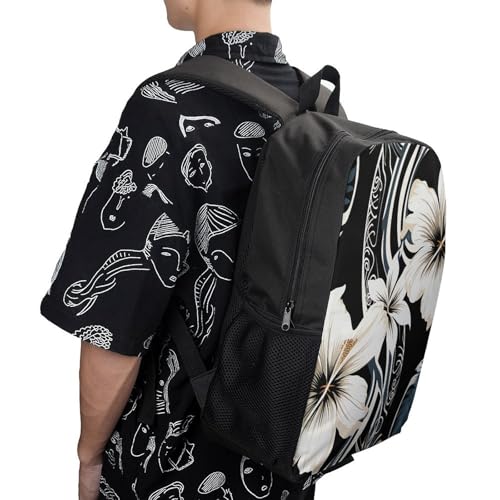 HOT ! Black And White Hawaiian Flowers Backpack - Durable 600D Polyester, 17 Inch Backpack with Ergonomic Adjustable Straps, Lightweight Travel Bag for Men & Women