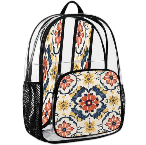 HOT ! Boho Abstract Colorful Floral Clear Backpack for Stadium Events, Vintage Flowers Waterproof Clear Bag for Women Men Adult Sport Work Daily Music Festival and Concerts