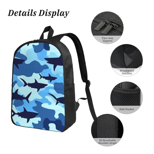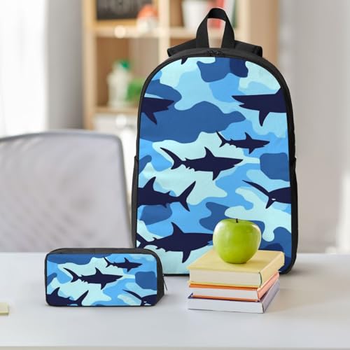 Backpack For Unisex, Water Resistant Backpack With Insulated Lunch Bag & Pencil Pouch (for Cool Blue Shark Camo) 1