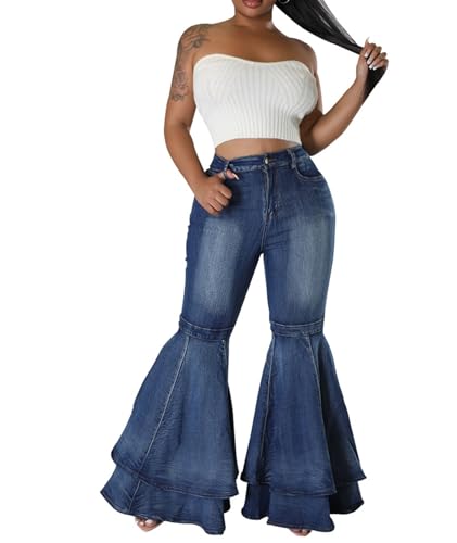 Sexyshine Women's Bell Bottom Jeans High Waist Ruffle Flared Tiered Denim Pants Retro 70s Wide Leg Long Pants 6