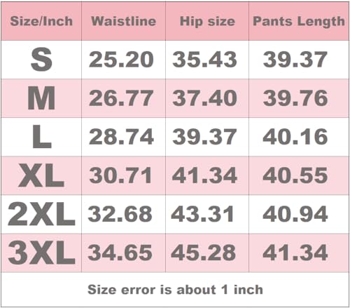 • Size Details : S : Waist: 25.20", Hip: 35.43", Pants Length: 39.37"; M : Waist: 26.77", Hip: 37.40", Pants Length: 39.76"; L : Waist: 28.74", Hip: 39.37", Pants Length: 40.16"; XL : Waist: 30.71", Hip: 41.34", Pants Length: 40.55"; 2XL : Waist: 32.68", Hip: 43.31", Pants Length: 40.94"; 3XL : Waist: 34.65", Hip: 45.28", Pants Length: 41.34". The measurement error is about 1 inch.