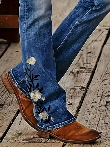 Women's Flower Embroidered High Stretch Jeans High Waistband Pocket Slim Fit Flared Jeans 1