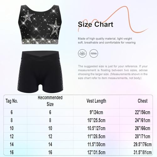 Kids Girls Gymnastics Dance Outfit Rhinestone Crop Vest Top Shorts Set Athletic Tracksuits for Yoga Black 12 Years 6