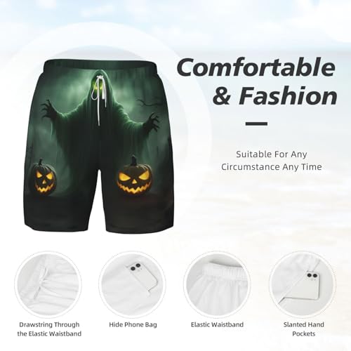 HOT ! Green Ghost Horror Halloween Pumpkin Men's Soft Double Swim Shorts, Lounge Swiming Shorts Pants Breathable Summer