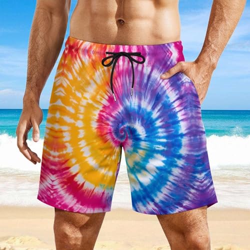 HOT ! Tie Dye Colorful Rainbow Mens Swim Trunks with Quick-Drying Lining Beach Shorts for Outdoor Sports