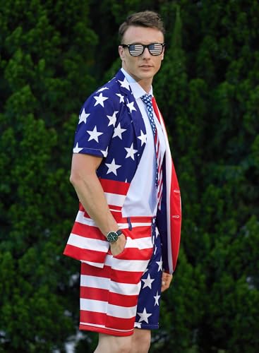 • 4TH OF JULY SUIT - Show your patriotism in style with Our Patriotic 2 Piece Suit, featuring classic American Flag design, Stripes and Stars patterns. Come with a Blazer paired with a Tie and Short, must sure to help you stand out in the crowd!