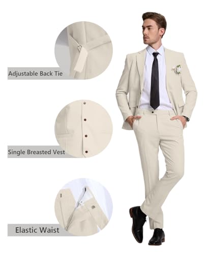 3 Piece Men's Linen Suit,Slim Fit Suits Set for Men Two Buttons Grooms Suits for Summer Beach Wedding 3