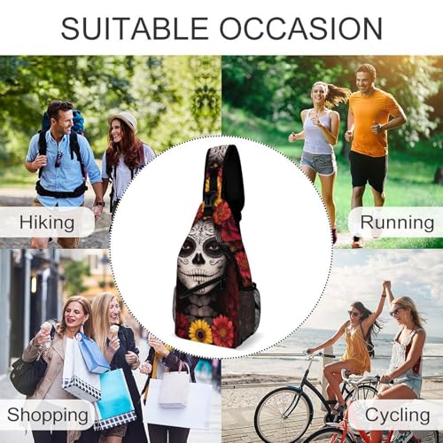 Men's Small Day Pack, Cross Body Sling Bag, Travel Hiking Fashion Chest Bag Mexican Day of The Dead Sugar Skull Floral Women Art 4
