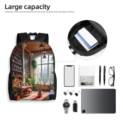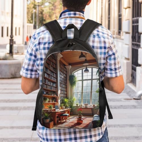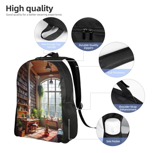 HOT ! Comfort Fit Unisex Large Room Wooden Beams Bookshelves Filled Books Backpack Durable Daily Commute Travel Adventures 16 in