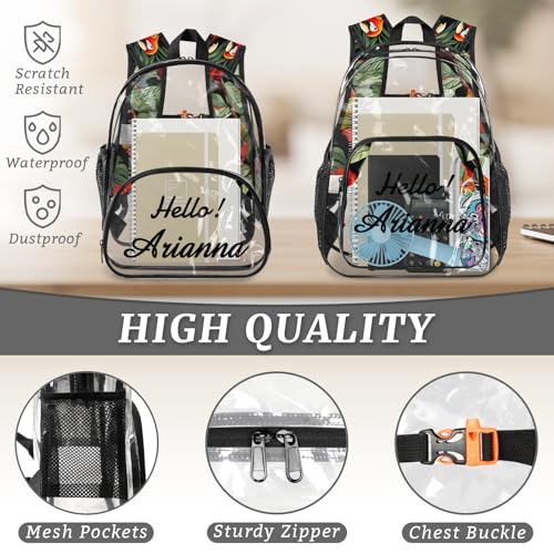 HOT ! Tropical Bird Parrot Personalized Small Clear Backpack Heavy Duty for Stadium Approved Custom Green Palm Leaves Floral PVC Transparent Backpack with Name See Through Bag for Concerts