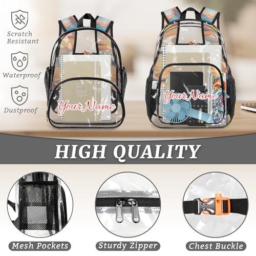 HOT ! Personalized Small Clear Backpack Stadium Approved Heavy Duty PVC Plastic Custom Transparent Backpacks See Through Bag with Name, Ocean Beach Sunrise Sunset