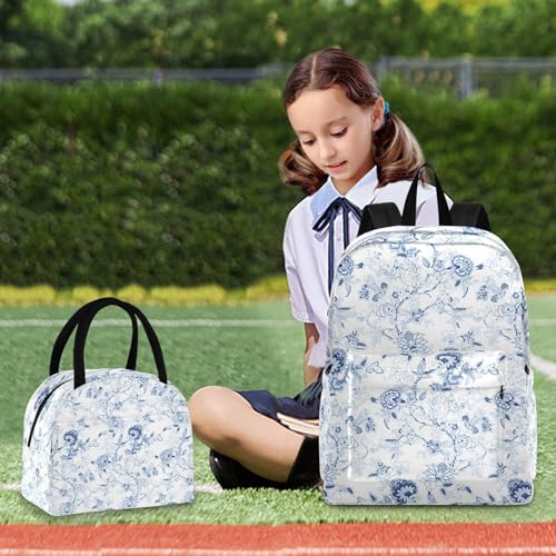 Blue White Floral Backpack for Kids, Girls Boys Lightweight Elementary Bookbag with Lunch Box 1