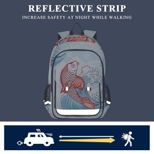 More information about Kids School Backpack for Boys Girls, Cute Japanese Fish Blue Large Kids Backpack with Chest Strap, 6-12 Y School Bag with Front Flap, 17 Inch