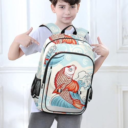 HOT ! Kids School Backpack for Boys Girls, Cute Japanese Fish Blue Large Kids Backpack with Chest Strap, 6-12 Y School Bag with Front Flap, 17 Inch