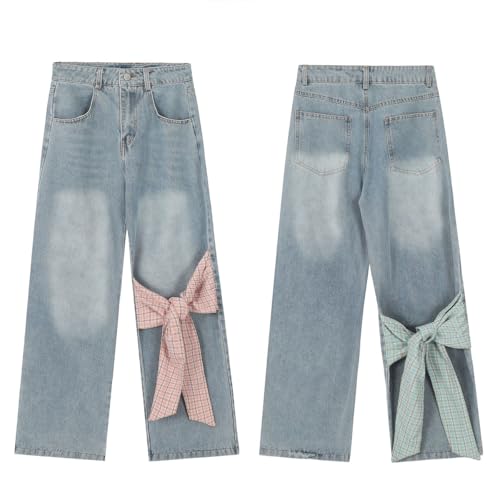 HOT ! Fashion Straight High Waisted Wide Leg Jeans Casual Y2K Gradual Plaid Bow Tie Patchwork Denim Pants