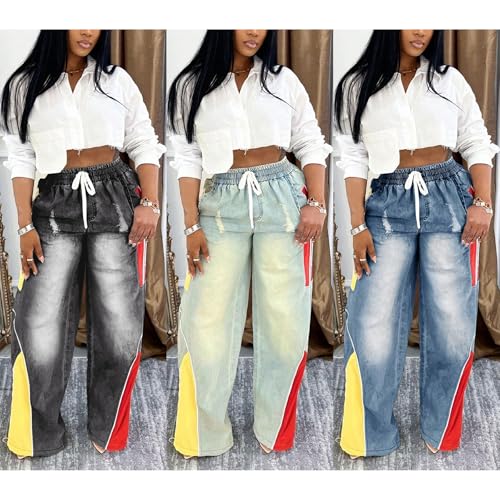 More information about Women Wide Leg Patchwork Jeans Drawstring Elastic High Waist Striped Color Block Ripped Ombre Baggy Denim Pants
