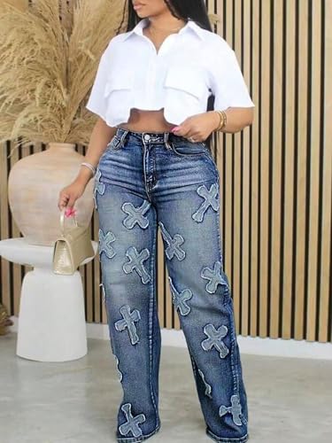 Womens Jeans high Waisted Embroidered Baggy Loose fit Vintage 90s Streetwear Hip hop Fashion Pants with 3D Cross Patches 3