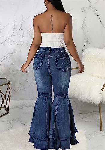 HOT ! Cute Bell Bottom Jeans for Women High Waist Flare Jeans Patchwork Pleated Layered Ruffle Hem Wide Leg Denim Long Pants