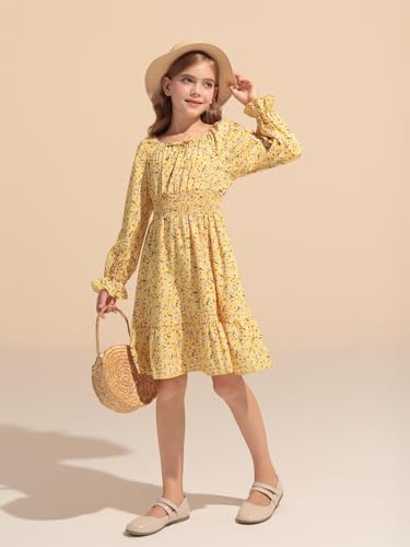 HOT ! Haloumoning Girls Dresses Kids Floral Long Lantern Sleeve Square Neck Smocked Flowy Dress 5-14 Years